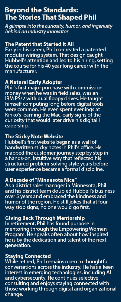 Today, Phil remains engaged with the industry as a mentor and advisor. After retiring from Hubbell he has worked with a couple of mentees within the industry’s Empowering Women Program, consults selectively with manufacturers, and follows emerging developments shaping the next era of digital strategy.